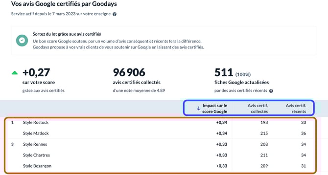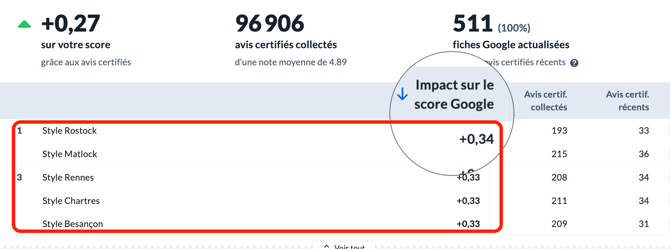 • Cette section offre une vue de l'impact des avis certifiés sur le score Google des points de vente du client, depuis la date de début spécifiée de ce service.